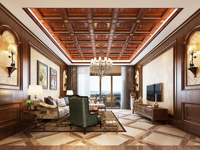 美式古典風酒紅色的深沉質感,散發著迷人而成熟神秘的魅力。燈光帶與橫梁架構交錯衍生,帶來熠熠璀璨的視覺享受,多層次的躍層效果是整個頂部更加古典優雅,仿佛置身于中世紀的羅馬時代。
