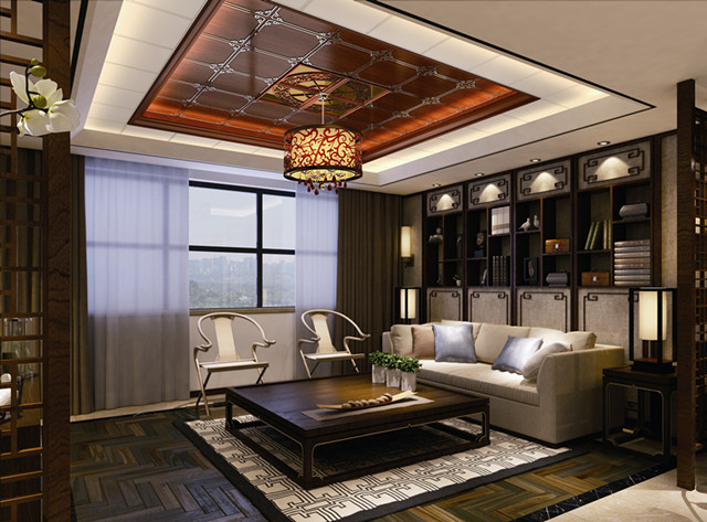 大面積白色的客廳吊頂布局使空間顯得簡約大氣。層層遞進的躍層造型,有助于實現輕松、隨意的生活方式。中央區域帶有精美紋飾的板材與燈帶的點綴,增添了空間的美感與情調,又豐富了客廳的藝術內涵。