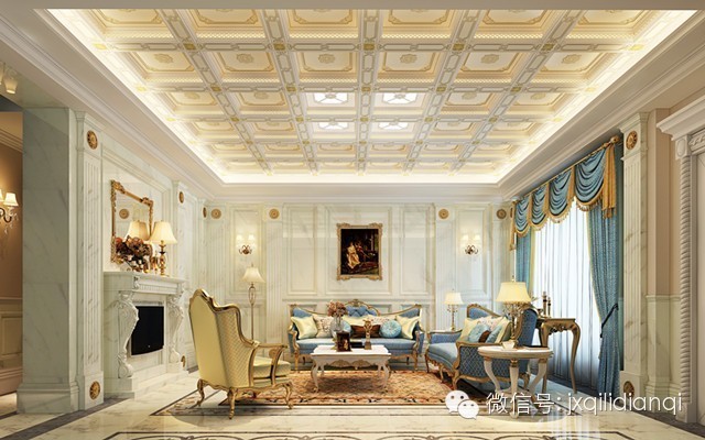 美式古典風格在空間上追求連續性,追求形體的變化和層次感。這個房間以美式古典宮廷風格為主,以復古的白色和金色為基調。室內外高貴典雅,光影變化豐富。為體現宮廷風格,家具、門,窗都漆成白色,藍色的布藝沙發,金色的畫框壁畫,金色系的地毯,帶有一種異域的視覺沖擊。用壁爐的造型打造的電視柜使得一家人看電視時的感覺更為溫馨。