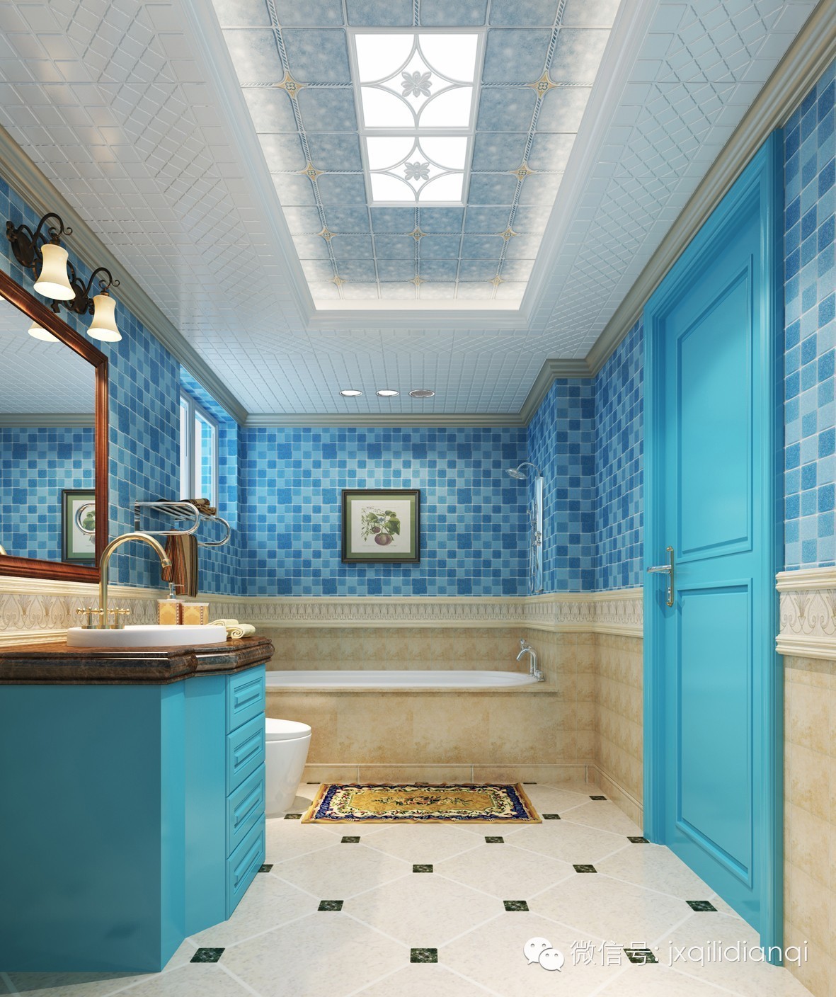 衛浴間的設計也是非常清爽,在追求時尚個性的今天,人們對于家居的裝修上也非常講究獨特性。無論浴室是大是小,只要通過悉心的打扮,便可以凸顯另一番如畫的風景。衛浴間運用清爽的藍色,黃色的浴缸外邊更是顯示了地中海的風格,色調不一的藍色墻磚和頂上的淺藍吊頂遙相呼應,猶如藍色海洋,在這樣的藍色環境下泡澡,別有一番風味。