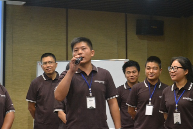 在奇力營銷部張經理一個簡單的情景案例后,導購培訓的課程正式開啟。在培訓會上,學員們們邊聽邊做著筆記。在歡樂的討論氣氛下,各個小隊的代表按照各自的營銷經驗,從材質、價格、環保等方面介紹產品,以求第一時間吸取知識和找準進步和跨越的方向。